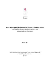 See, N. H. (2024) How pianists programme lesser-known solo repertoire: an autoethnography through Clara Schumann’s Sonata and interviews with four pianists. Doctoral thesis, Royal College of Music.